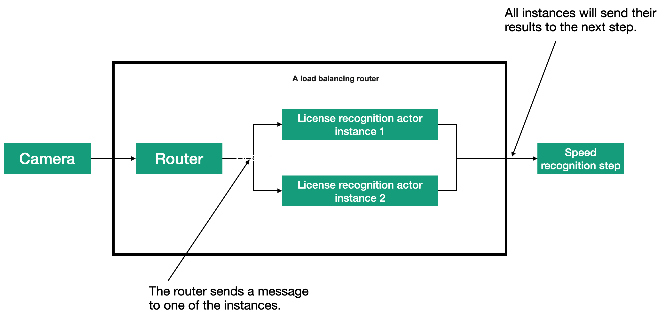 In the figure below, you can see that the router is capable of sending messages to one of the LicenseRecognition actor instances. When a message hits the router, the router selects one of the available actors and sends it to that actor. When it receives the next message, the router chooses another actor and sends it to that actor.