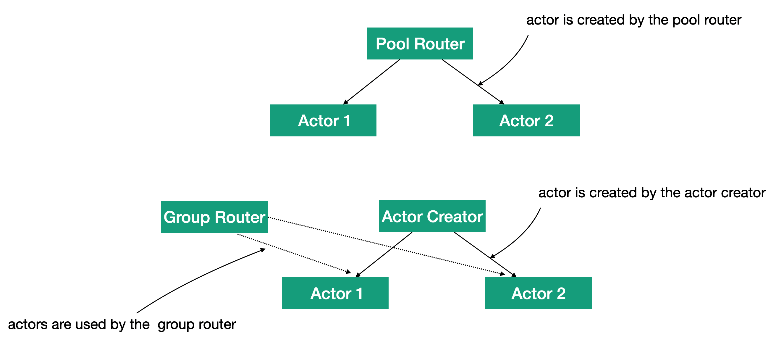 In the picture, you can see the difference between a pool and a group. When you use a pool, actors are descendants of a router, and when you use a router with a group, actors can be descendants of any other actor (in this example, the ActorCreator actor). Actors do not necessarily have to be descended from the same parent. They just have to be created and run.